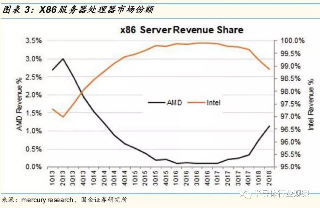 國金證券研報顯示,目前服務(wù)器CPU市場約為50億美金,英特爾雖然戰(zhàn)友全球98%以上的服務(wù)器CPU市場份額,但是未來將面臨兩大陣營的挑戰(zhàn), 一是采用AMR架構(gòu)的云計算廠商,比如亞馬遜、華為等,二是采用X86架構(gòu)的AMD陣營。