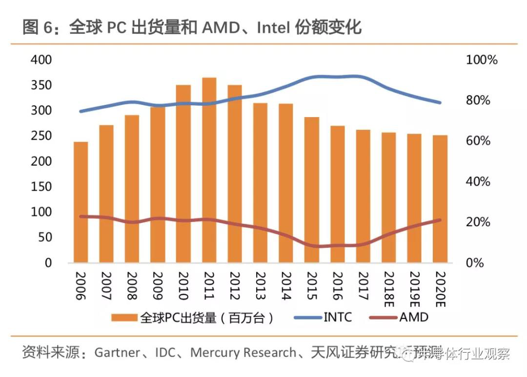 從2017年起AMD在CPU市場開始反彈。按照天正證券預(yù)測,今年AMD將在PC市場錄得13%的份額,2020年達到20%。