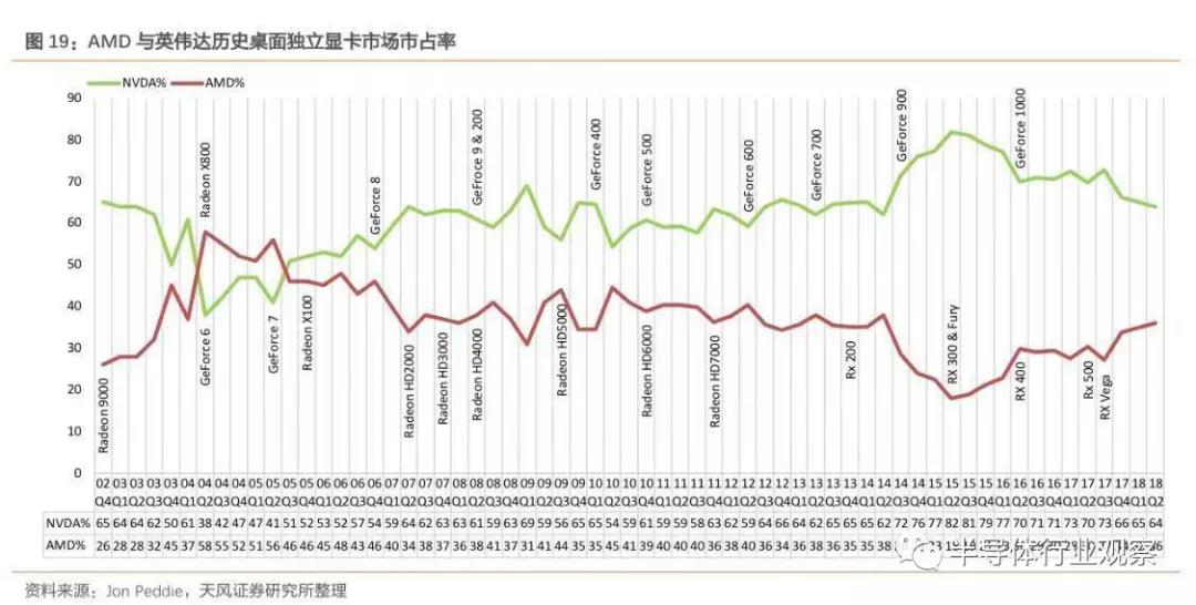 在GPU市場,AMD從2015年Q2之后開始震蕩上揚,市場份額從18%,一直上升到36%。