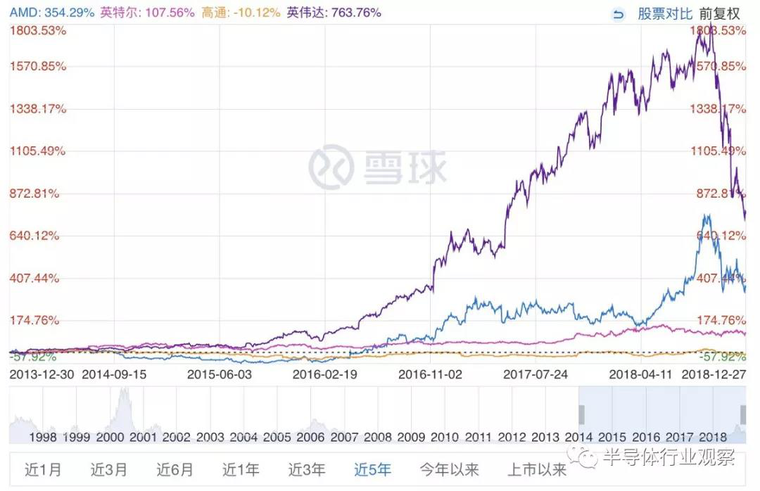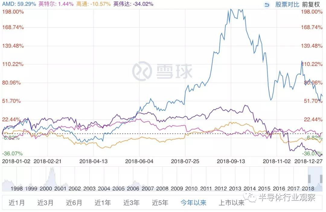 而今年以來的復(fù)權(quán)股價,AMD上漲59%,英特爾增長1.4%,英偉達和高通均為負增長。AMD今年的表現(xiàn)遠超其他幾家。