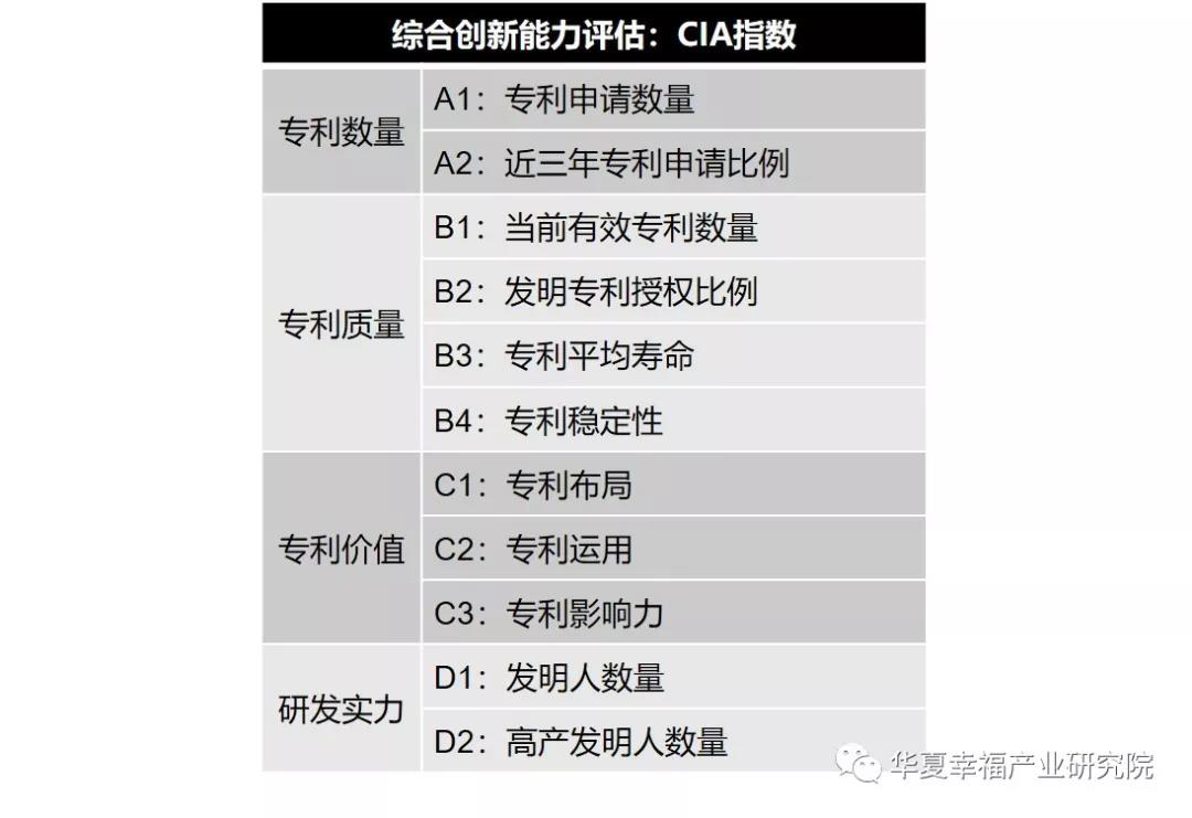 為衡量企業(yè)間專利的相對價值,我們構(gòu)建了一個CIA(Comprehensive Innovation Ability)指數(shù),以已公開專利為基礎(chǔ),從專利數(shù)量、專利質(zhì)量、專利價值和研發(fā)實力四個方面對潛在企業(yè)進行技術(shù)先進性評估。
