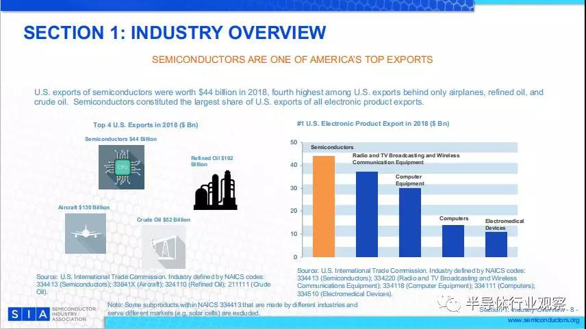 2018年,美國半導體出口額達440億美元,僅次于飛機、成品油和原油,位居美國出口第四位。半導體在美國所有電子產(chǎn)品出口中所占份額最大。