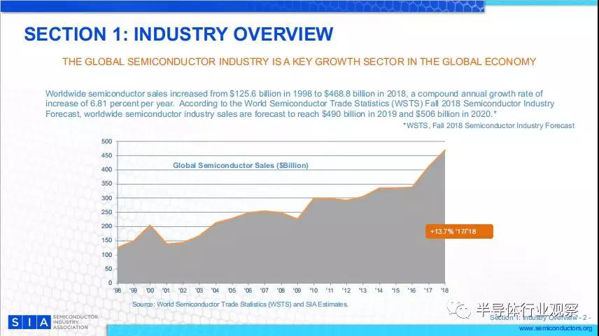 全球半導體銷售額從1998年的1256億美元增加到2018年的4688億美元,復合年增長率為每年6.81%。 根據(jù)世界半導體貿(mào)易統(tǒng)計(WSTS)2018年秋季半導體行業(yè)預測,預計2019年全球半導體行業(yè)銷售額將達到4900億美元,2020年將達到5060億美元。(*WSTS,2018年秋季半導體行業(yè)預測)