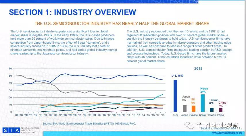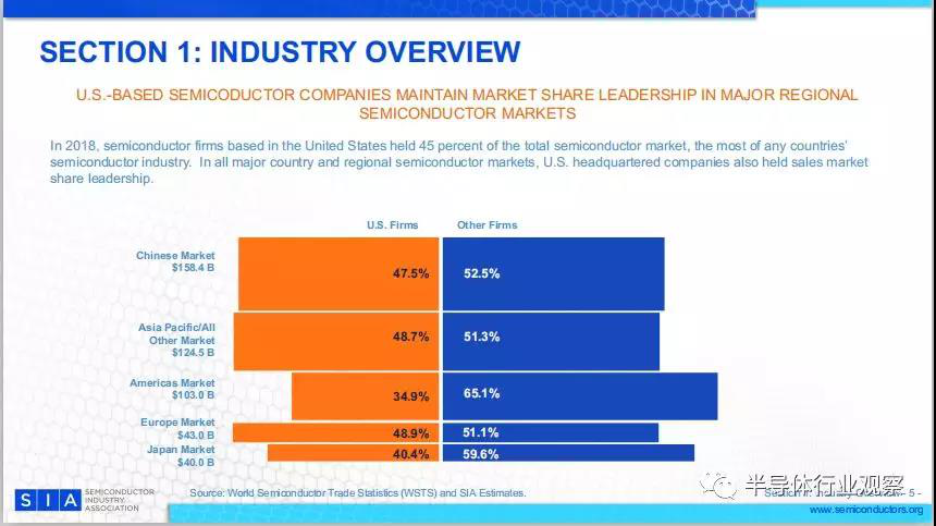 2018年,總部設在美國的半導體公司占據(jù)了整個半導體市場的45%,是所有國家半導體行業(yè)中最多的。在所有主要國家和地區(qū)的半導體市場中,美國公司保持了銷售市場份額的領先地位。