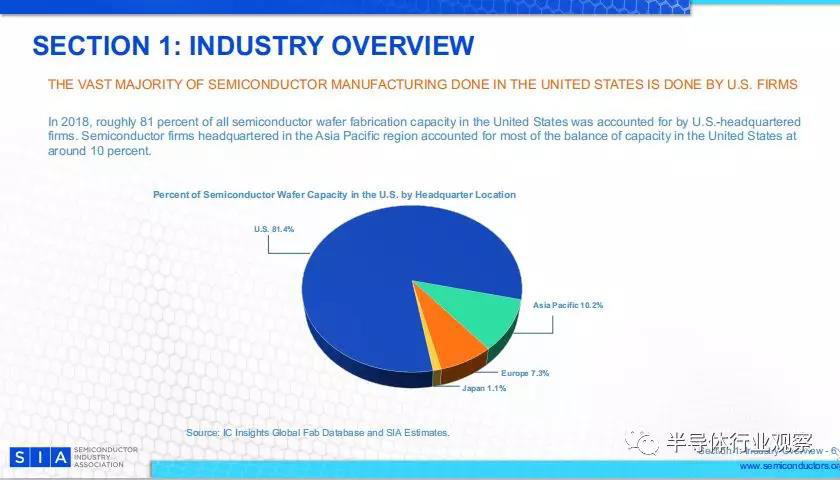 2018年,總部位于美國的公司占了美國半導體晶圓產(chǎn)能的81%??偛课挥趤喬貐^(qū)的半導體公司占美國產(chǎn)能約占10%。
