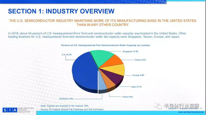 2018年,總部位于美國的半導體公司的前端半導體晶圓產(chǎn)能中約有44%是美國完成的,其他主要地點是新加坡,臺灣,歐洲和日本。