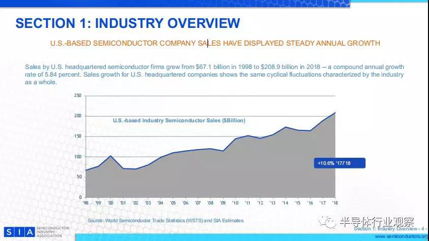 美國總部半導體公司的銷售額從1998年的671億美元增長到2018年的2089億美元 ,復合年增長率為5.84%。 美國總部公司的銷售增長顯示了整個行業(yè)的周期性波動。