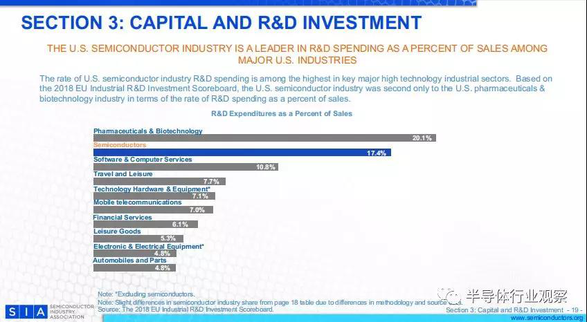 美國半導體工業(yè)的研發(fā)支出在主要的高科技產(chǎn)業(yè)中是最高的。基于2018年歐盟工業(yè)R&D記分牌,美國半導體產(chǎn)業(yè)在研發(fā)支出占銷售額百分比而言,僅次于美國制藥和生物技術(shù)行業(yè)。數(shù)據(jù)顯示,美國半導體的研發(fā)投入占比為17.4%%。