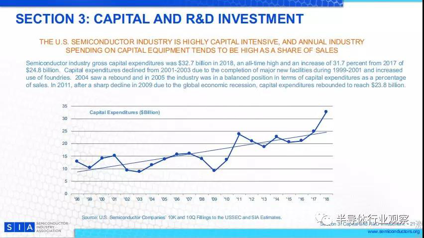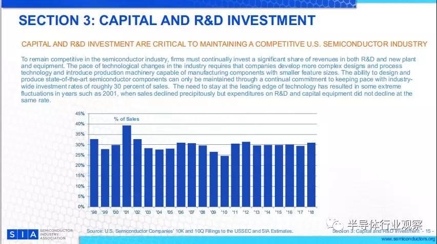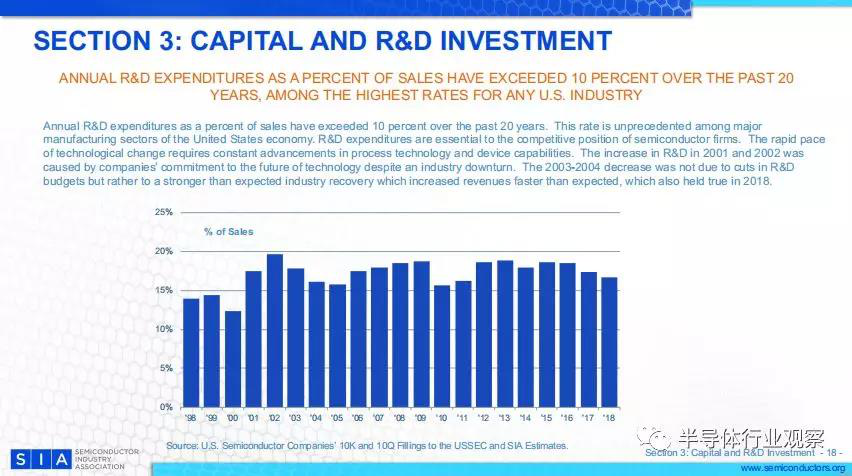 在過去的20年里,研發(fā)支出占銷售額的比例已經(jīng)超過了10%。這一比例在美國經(jīng)濟的主要制造業(yè)部門中是前所未有的。研發(fā)費用對半導體企業(yè)的競爭地位至關重要??焖俚募夹g(shù)變革要求在工藝技術(shù)和設備能力方面不斷進步。2001年和2002年的研發(fā)增長是由于公司在行業(yè)不景氣的情況下對未來技術(shù)的承諾。2003至2004年的下降并不是由于研發(fā)預算的削減,而是因為行業(yè)復蘇強于預期,2018年也是如此。