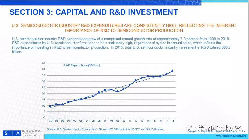 從1998年到2018年,美國半導體產(chǎn)業(yè)研發(fā)支出的復合年增長率約為7.3%。美國半導體公司的研發(fā)支出一直很高,無論年銷售周期如何,都反映了投資半導體研發(fā)對半導體生產(chǎn)的重要性。 2018年,美國半導體產(chǎn)業(yè)在研發(fā)方面的投資總額達到387億美元。