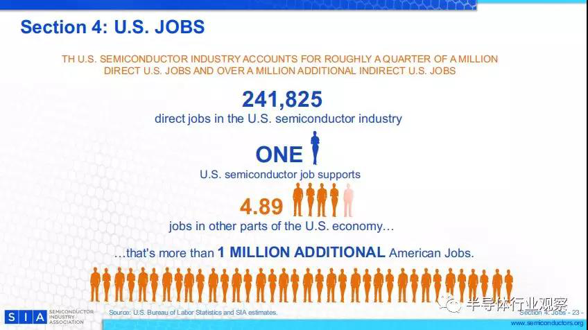 數(shù)據(jù)顯示,美國本土從事半導體產(chǎn)業(yè)的人有241825人。而半導體間接相關的美國就業(yè)崗位超過100萬。