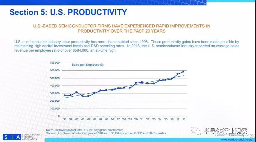 自1998年以來,美國半導體工業(yè)的勞動生產(chǎn)率翻了一番多。這些生產(chǎn)力的提高是通過保持高資本投資水平和研發(fā)支出率來實現(xiàn)的。數(shù)據(jù)顯示,2018年,美國半導體行業(yè)平均每名雇員的銷售收入超過584,000美元,創(chuàng)歷史新高。