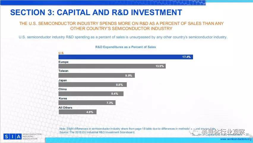 美國半導體工業(yè)的研發(fā)支出占銷售額的百分比是任何其他國家半導體工業(yè)無法比擬的。如下圖所示,歐洲半導體的研發(fā)投入為13.9%,中國臺灣為9.9%,日本為8.8%,中國大陸為8.4%,韓國為7.3%。而其他國家為4.9%。