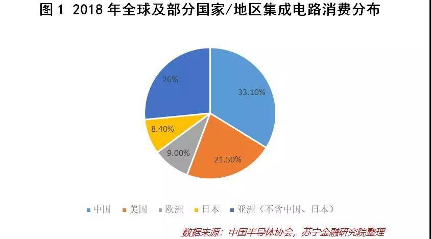 從規(guī)模上看,中美兩國是當(dāng)之無愧的集成電路大國。2018年,集成電路在亞太地區(qū)的銷售額約為2376億美元,占全球市場的比重高達(dá)60.34%,是全球最大的集成電路市場。其中,中國和美國已經(jīng)成為全球半導(dǎo)體兩個(gè)最大的消費(fèi)市場,其市場規(guī)模占比分別為33%、22%(參見圖1)。