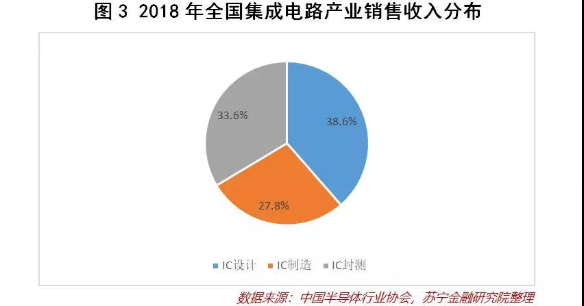 其中,IC設(shè)計(jì)、制造和封測三足鼎立。IC設(shè)計(jì)為2519.3億元,占比38.6%;IC制造為1818.2億元,占比27.8%;IC封測為2193.9億元,占比33.6%(參見圖3)。