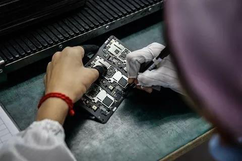 2015年12月24日,廣東東莞,工作人員正在對手機(jī)主板進(jìn)行標(biāo)記。芯片的核心是集成電路。華為在芯片領(lǐng)域受限,體現(xiàn)的是中國集成電路被美國“卡脖子”的困境。圖/視覺中國