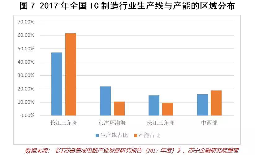 與IC設(shè)計(jì)業(yè)相比,中國IC制造業(yè)集中度相對較高。其中,長三角地區(qū)有50條,占47.2%,產(chǎn)能(折合8英寸,下同)占比61.4%;京津環(huán)渤海地區(qū)有23條,占21.7%,產(chǎn)能占比10.4%;珠三角地區(qū)有16條,占15.1%,產(chǎn)能占比9.5%;中西部地區(qū)有17條,占16%,產(chǎn)能占比18.7%。